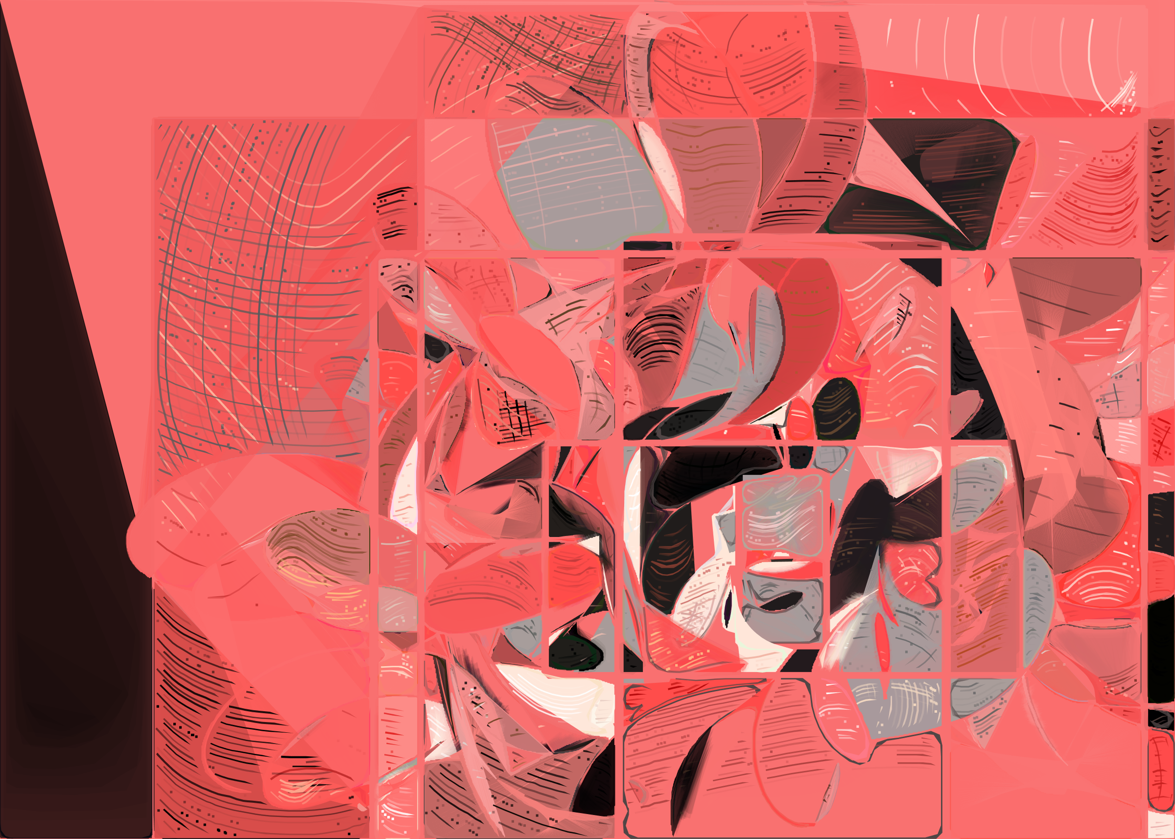 The rendering of **Running Moon** is inspired by stained glass and watercolor. It captures the sharpness of the glass and the softness of light using abstract forms. As organic shapes gradually expand to fill the space, brush-pen-like stripes solder these pieces together to form intricate compositions.