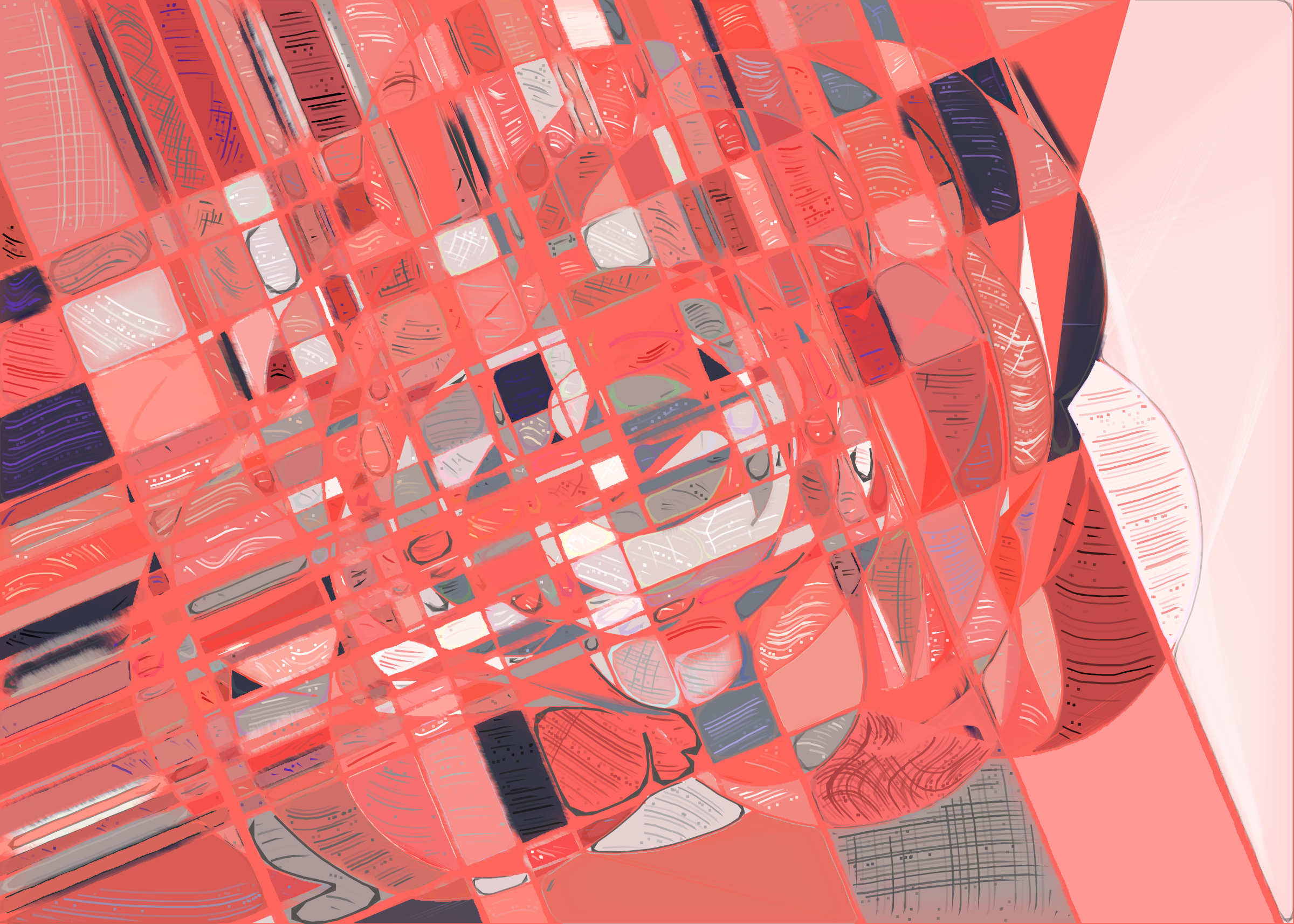 The rendering of **Running Moon** is inspired by stained glass and watercolor. It captures the sharpness of the glass and the softness of light using abstract forms. As organic shapes gradually expand to fill the space, brush-pen-like stripes solder these pieces together to form intricate compositions.