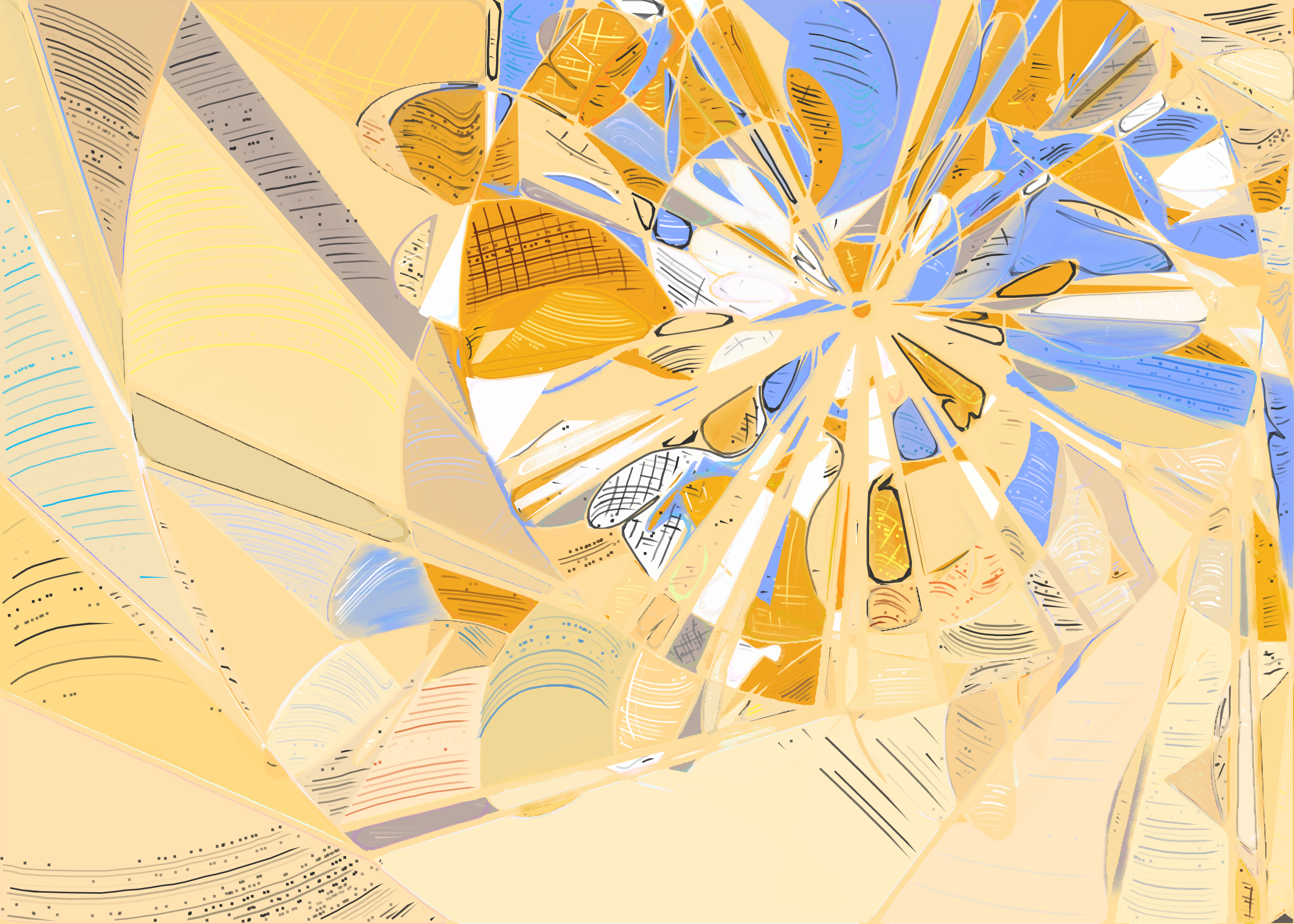 The rendering of **Running Moon** is inspired by stained glass and watercolor. It captures the sharpness of the glass and the softness of light using abstract forms. As organic shapes gradually expand to fill the space, brush-pen-like stripes solder these pieces together to form intricate compositions.