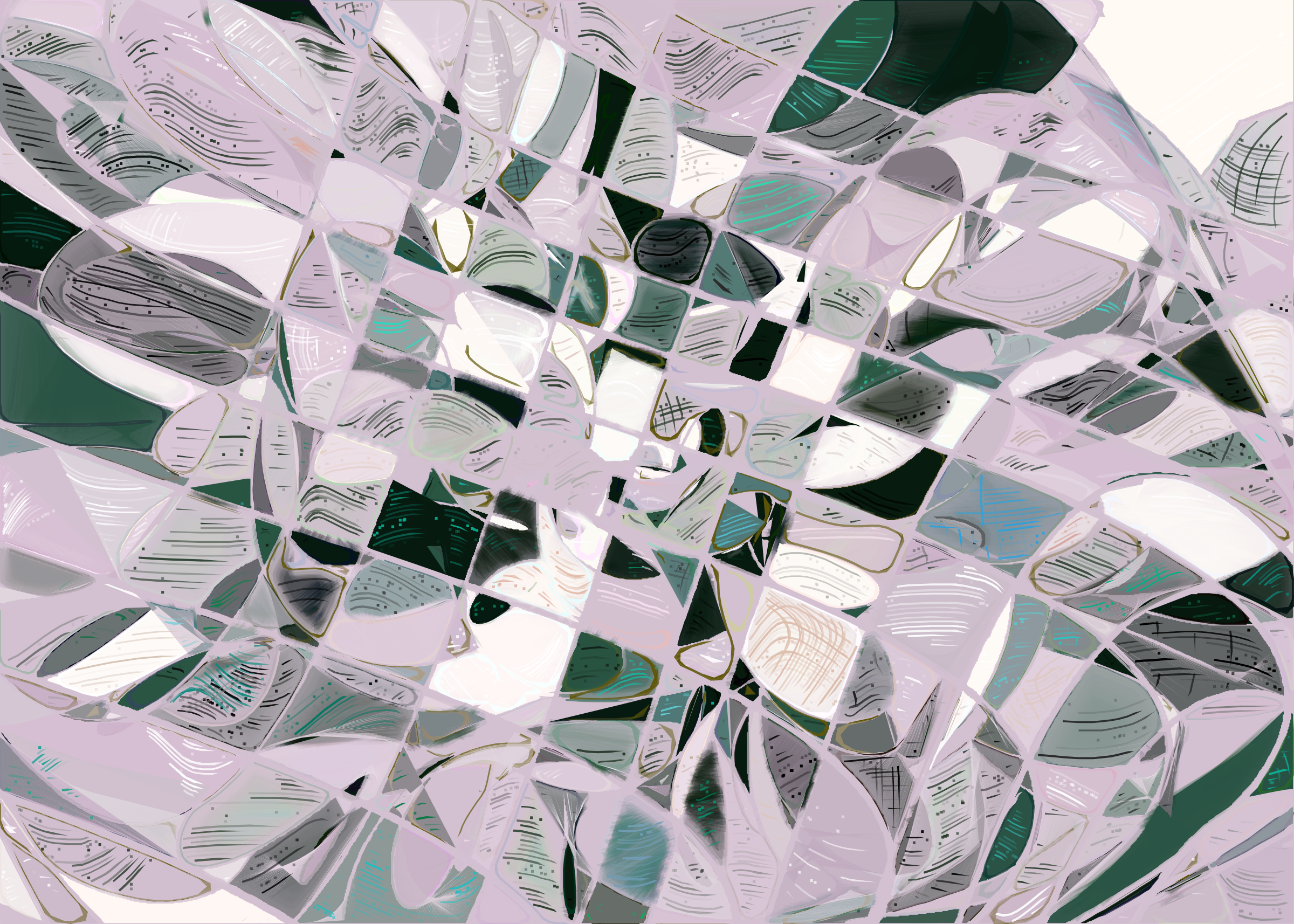 The rendering of **Running Moon** is inspired by stained glass and watercolor. It captures the sharpness of the glass and the softness of light using abstract forms. As organic shapes gradually expand to fill the space, brush-pen-like stripes solder these pieces together to form intricate compositions.