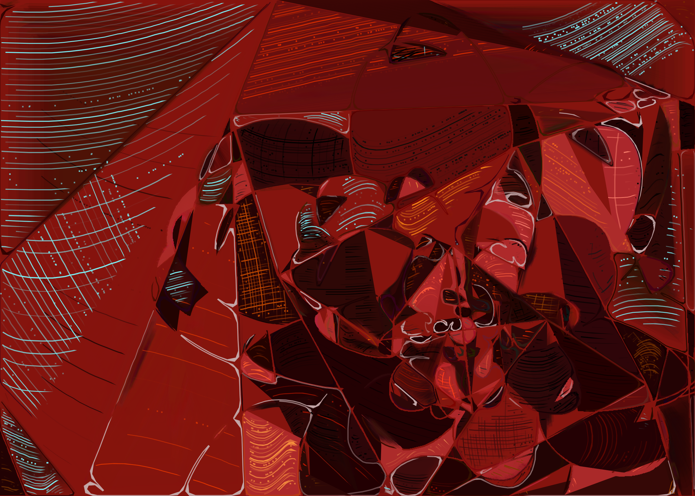 The rendering of **Running Moon** is inspired by stained glass and watercolor. It captures the sharpness of the glass and the softness of light using abstract forms. As organic shapes gradually expand to fill the space, brush-pen-like stripes solder these pieces together to form intricate compositions.