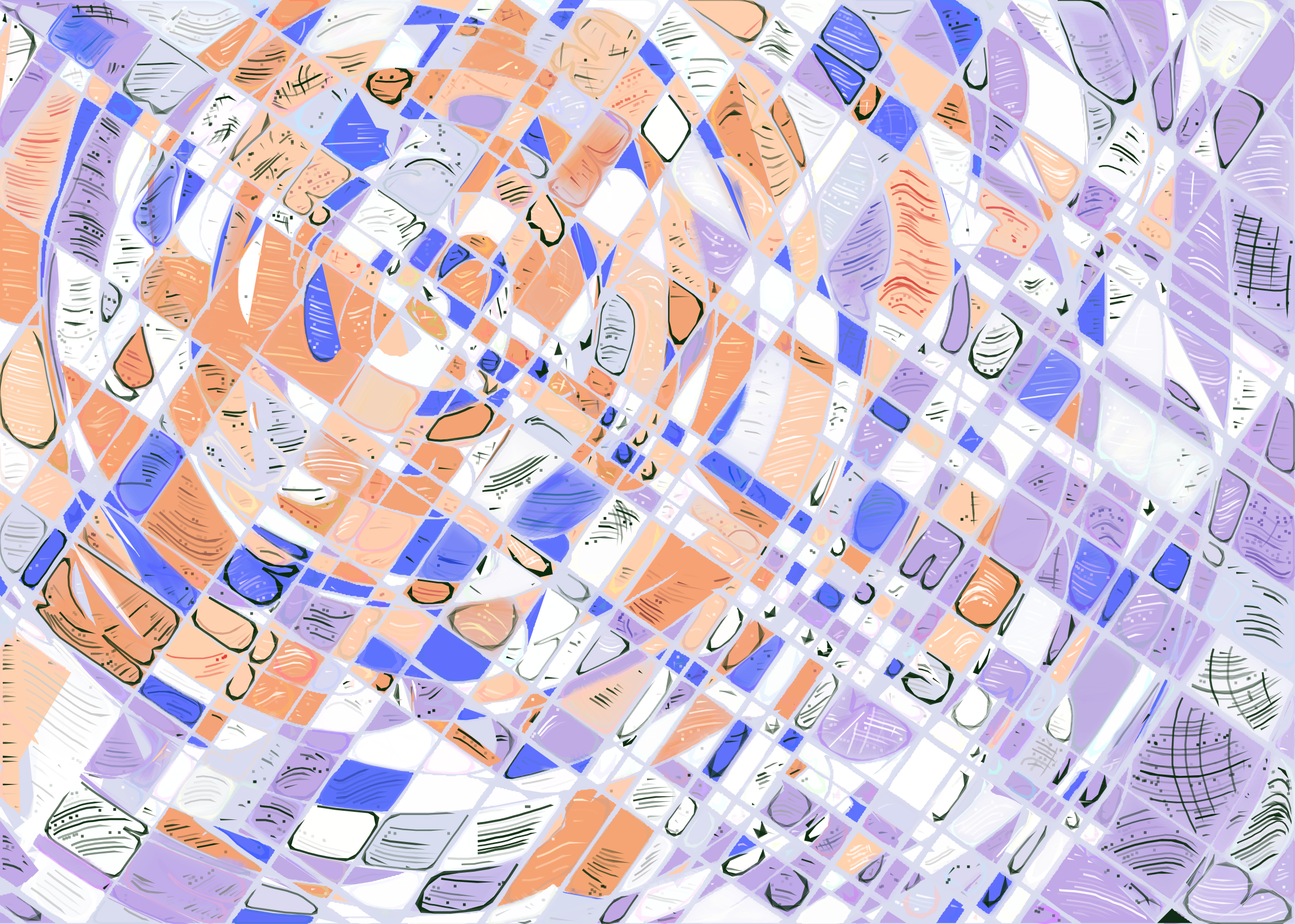 The rendering of **Running Moon** is inspired by stained glass and watercolor. It captures the sharpness of the glass and the softness of light using abstract forms. As organic shapes gradually expand to fill the space, brush-pen-like stripes solder these pieces together to form intricate compositions.