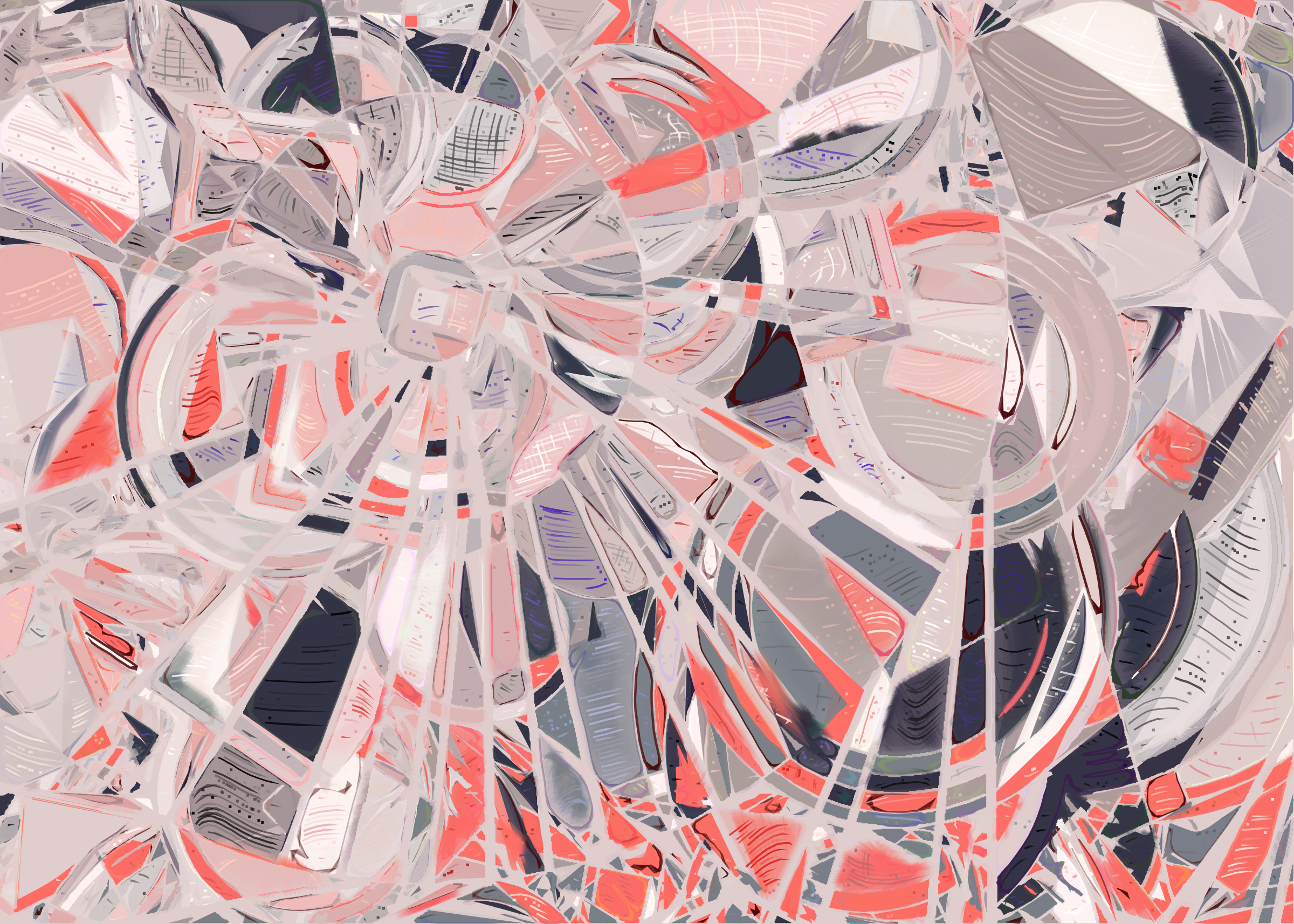 The rendering of **Running Moon** is inspired by stained glass and watercolor. It captures the sharpness of the glass and the softness of light using abstract forms. As organic shapes gradually expand to fill the space, brush-pen-like stripes solder these pieces together to form intricate compositions.