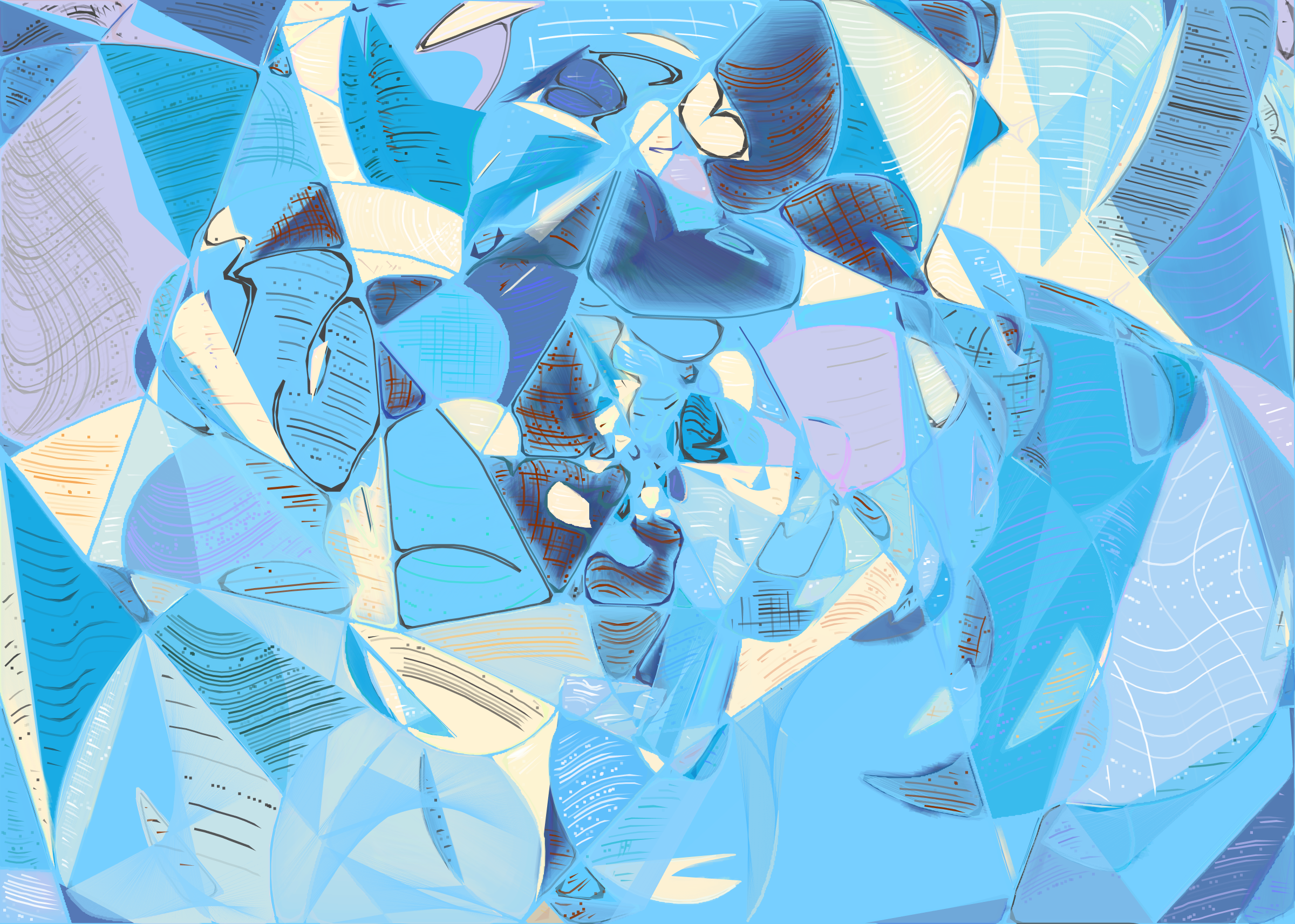 The rendering of **Running Moon** is inspired by stained glass and watercolor. It captures the sharpness of the glass and the softness of light using abstract forms. As organic shapes gradually expand to fill the space, brush-pen-like stripes solder these pieces together to form intricate compositions.