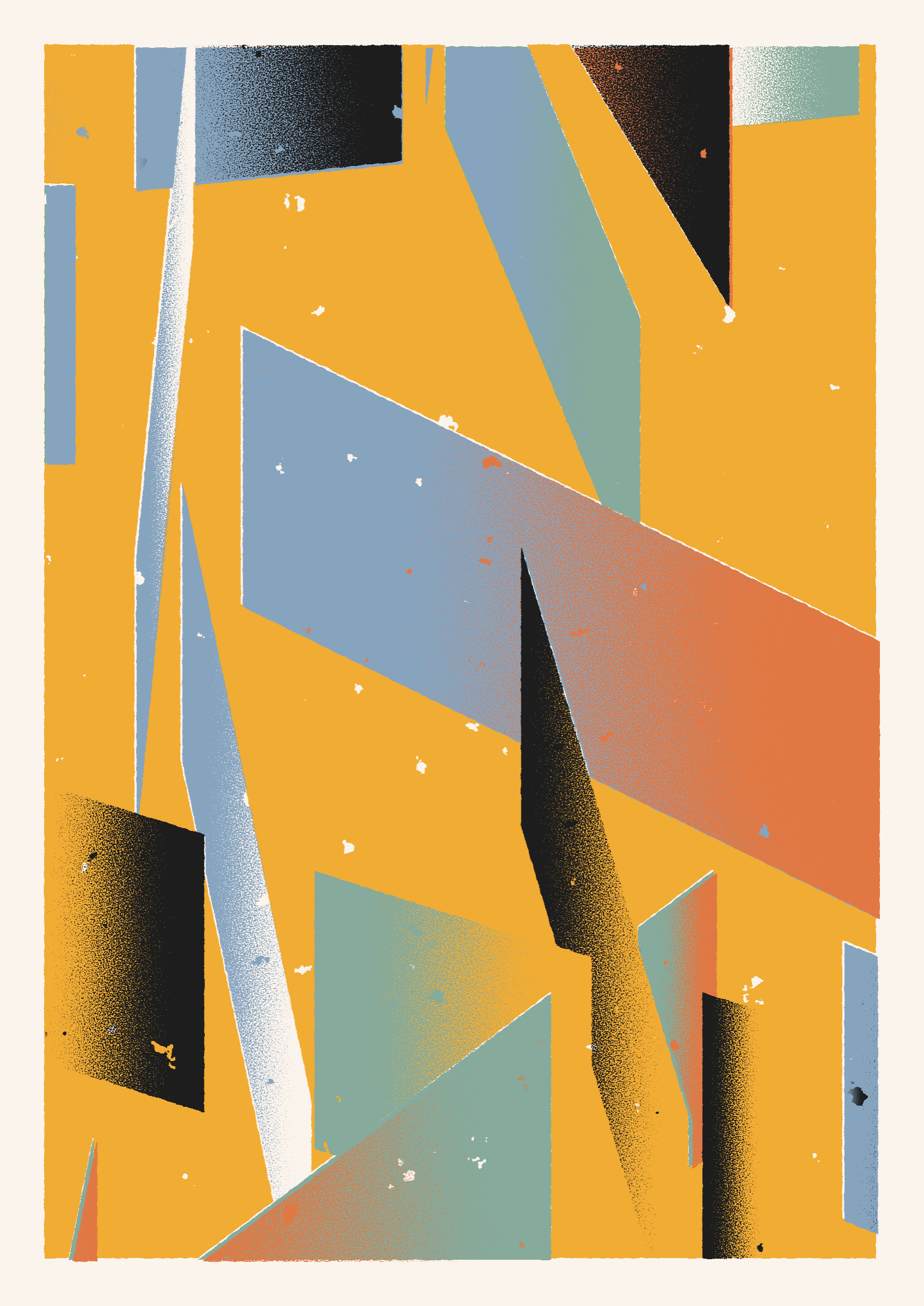 The generative system underlying the rendering mimics the screen printing process by rendering and applying a single color at a time to a master image. Each virtual screen may be more or less aligned with the master, creating a lovely flawed balance to the precision of the rendered geometry.