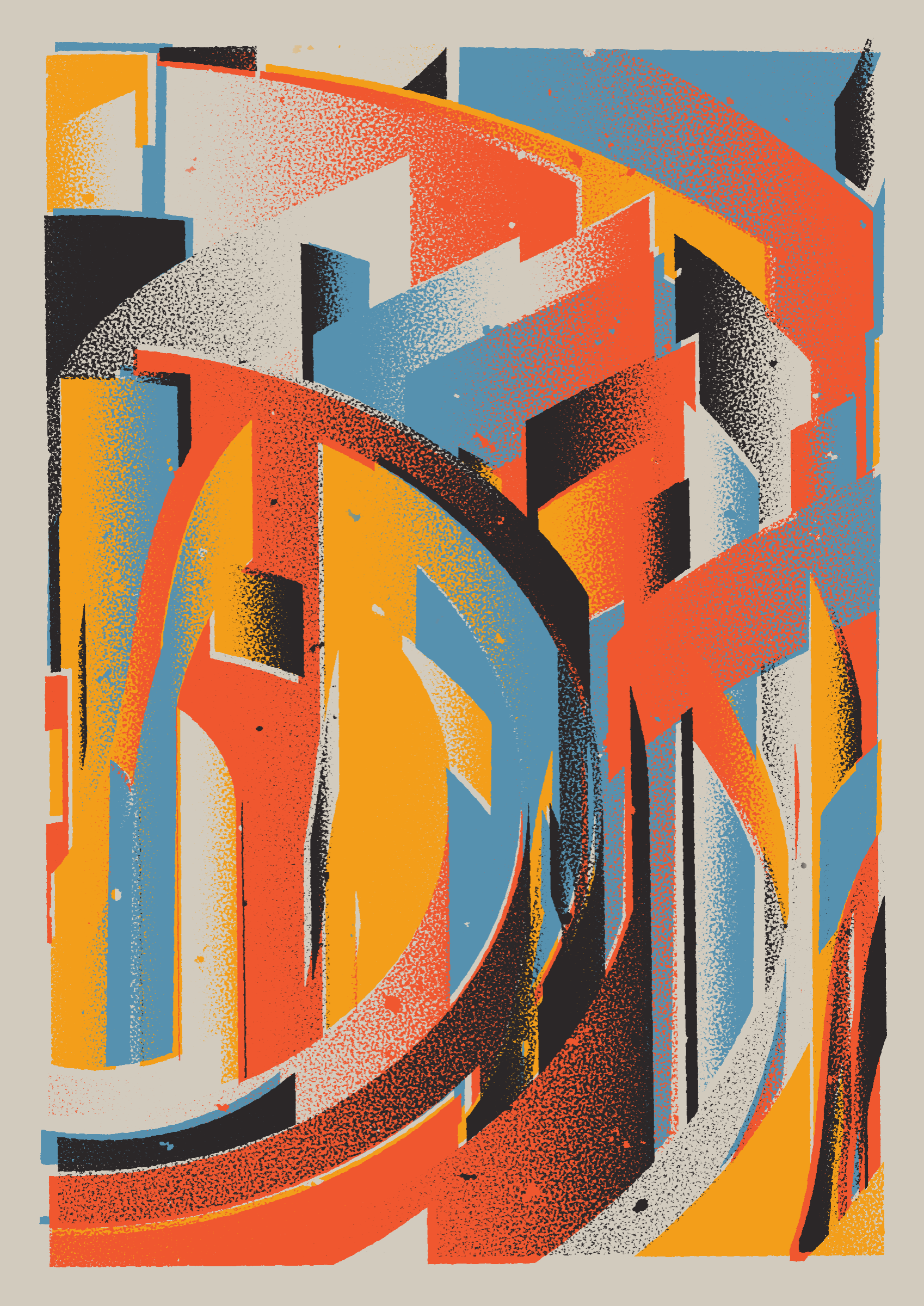 The generative system underlying the rendering mimics the screen printing process by rendering and applying a single color at a time to a master image. Each virtual screen may be more or less aligned with the master, creating a lovely flawed balance to the precision of the rendered geometry.