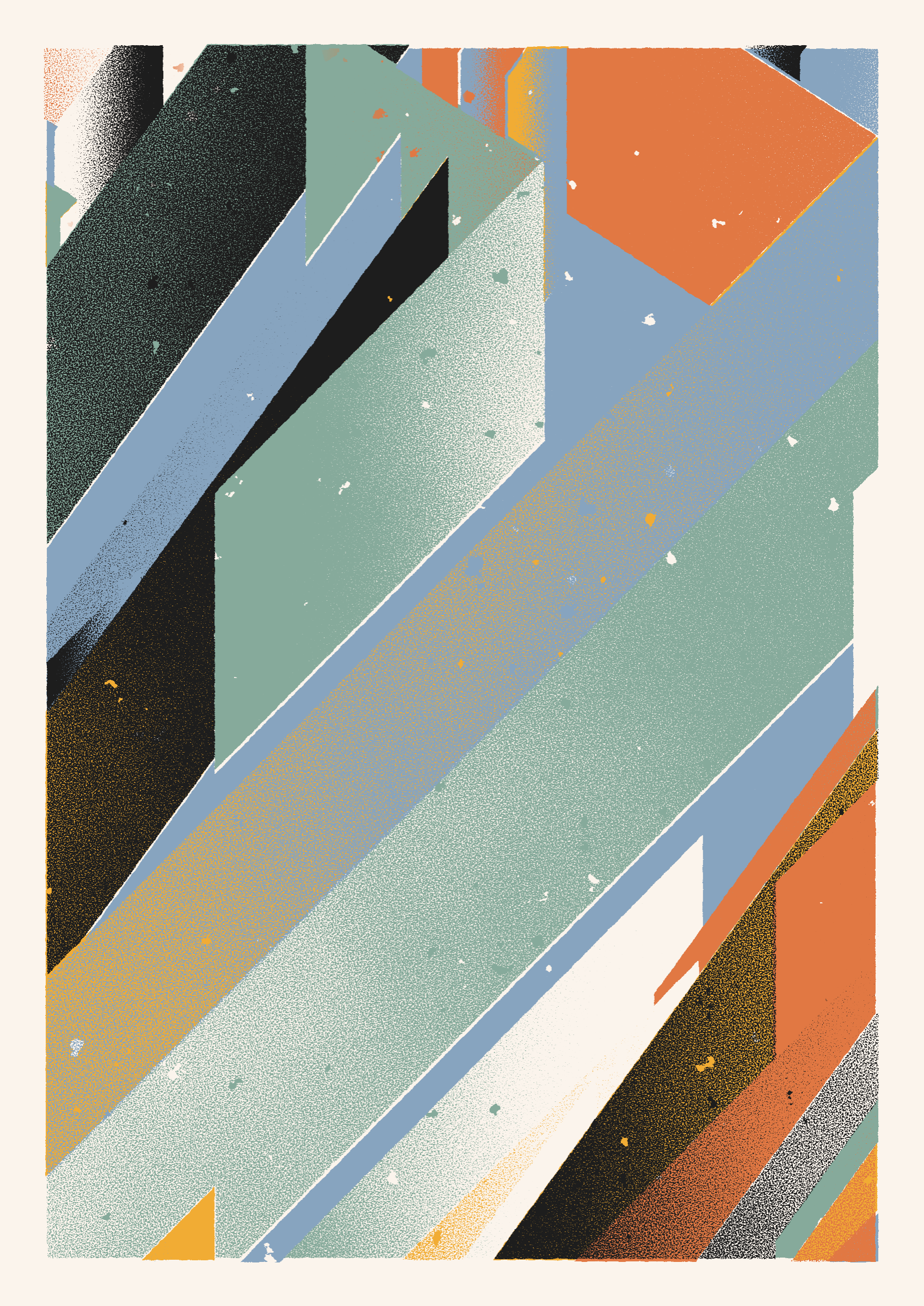 The generative system underlying the rendering mimics the screen printing process by rendering and applying a single color at a time to a master image. Each virtual screen may be more or less aligned with the master, creating a lovely flawed balance to the precision of the rendered geometry.