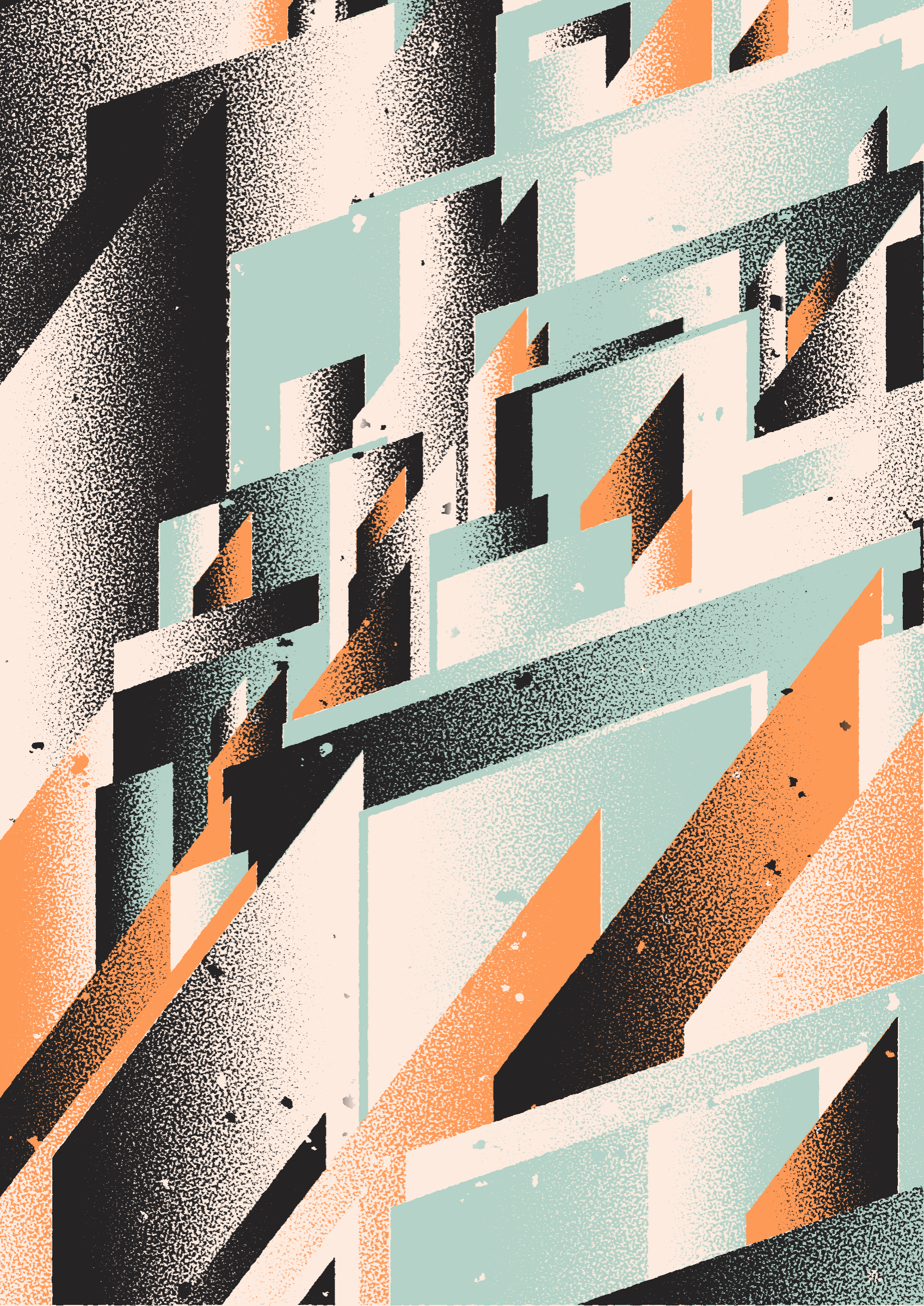 The generative system underlying the rendering mimics the screen printing process by rendering and applying a single color at a time to a master image. Each virtual screen may be more or less aligned with the master, creating a lovely flawed balance to the precision of the rendered geometry.