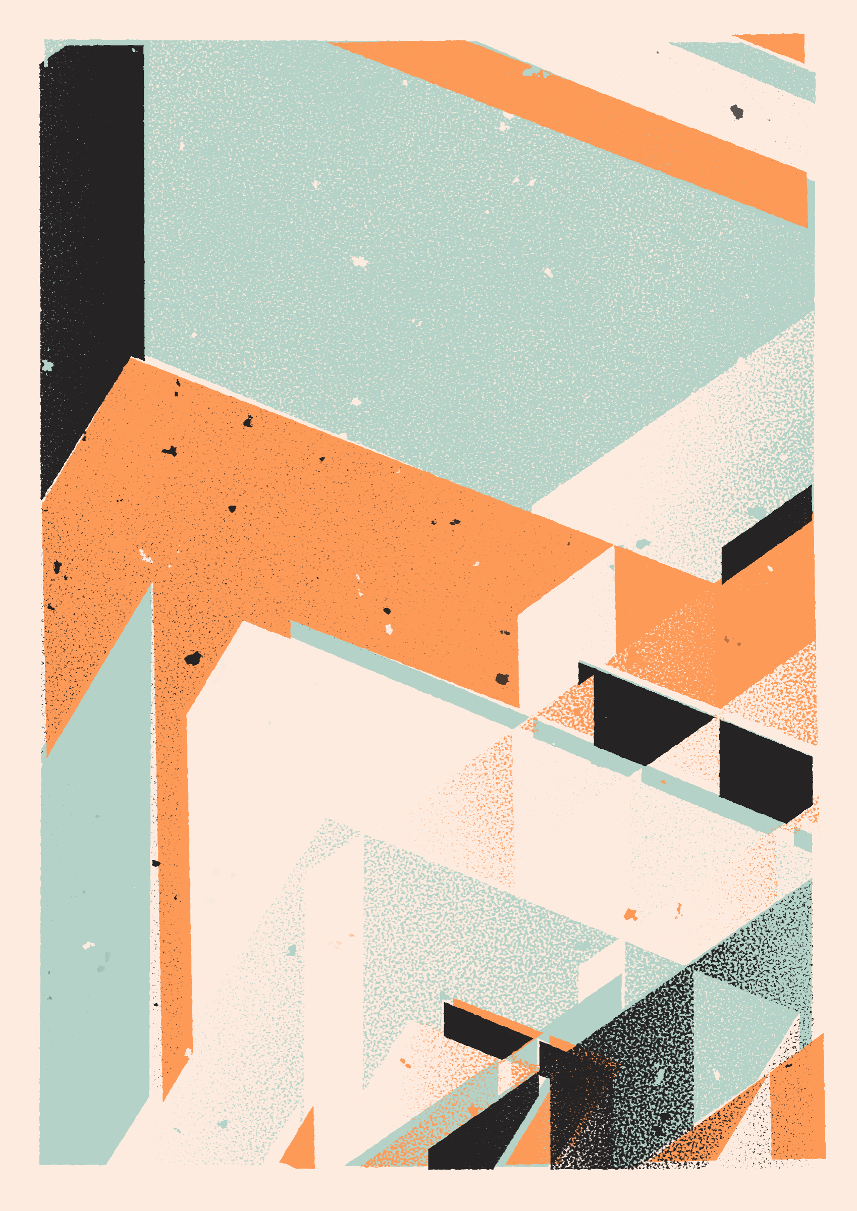 The generative system underlying the rendering mimics the screen printing process by rendering and applying a single color at a time to a master image. Each virtual screen may be more or less aligned with the master, creating a lovely flawed balance to the precision of the rendered geometry.
