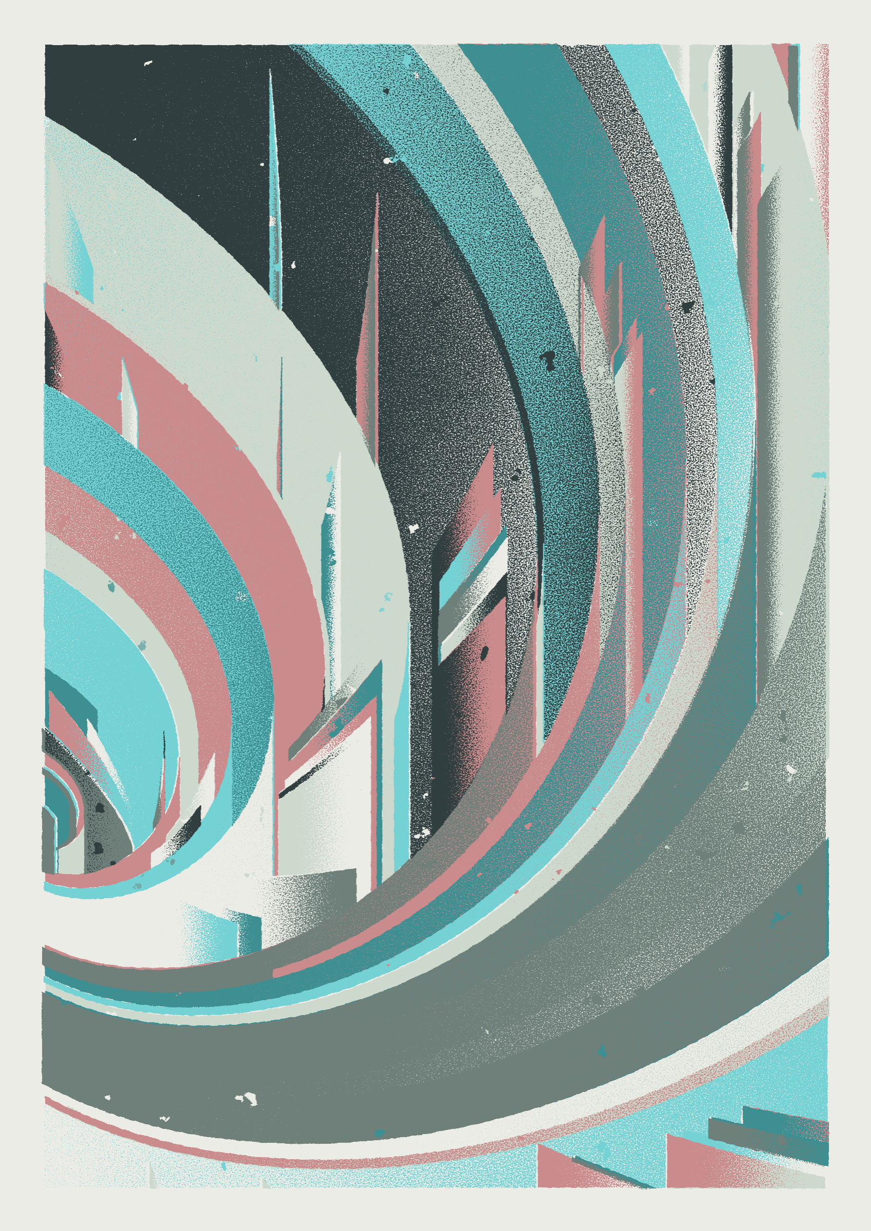 The generative system underlying the rendering mimics the screen printing process by rendering and applying a single color at a time to a master image. Each virtual screen may be more or less aligned with the master, creating a lovely flawed balance to the precision of the rendered geometry.