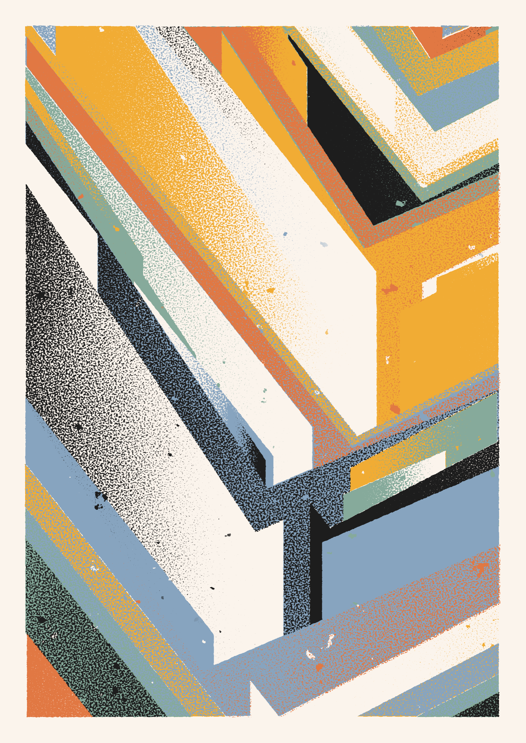 The generative system underlying the rendering mimics the screen printing process by rendering and applying a single color at a time to a master image. Each virtual screen may be more or less aligned with the master, creating a lovely flawed balance to the precision of the rendered geometry.