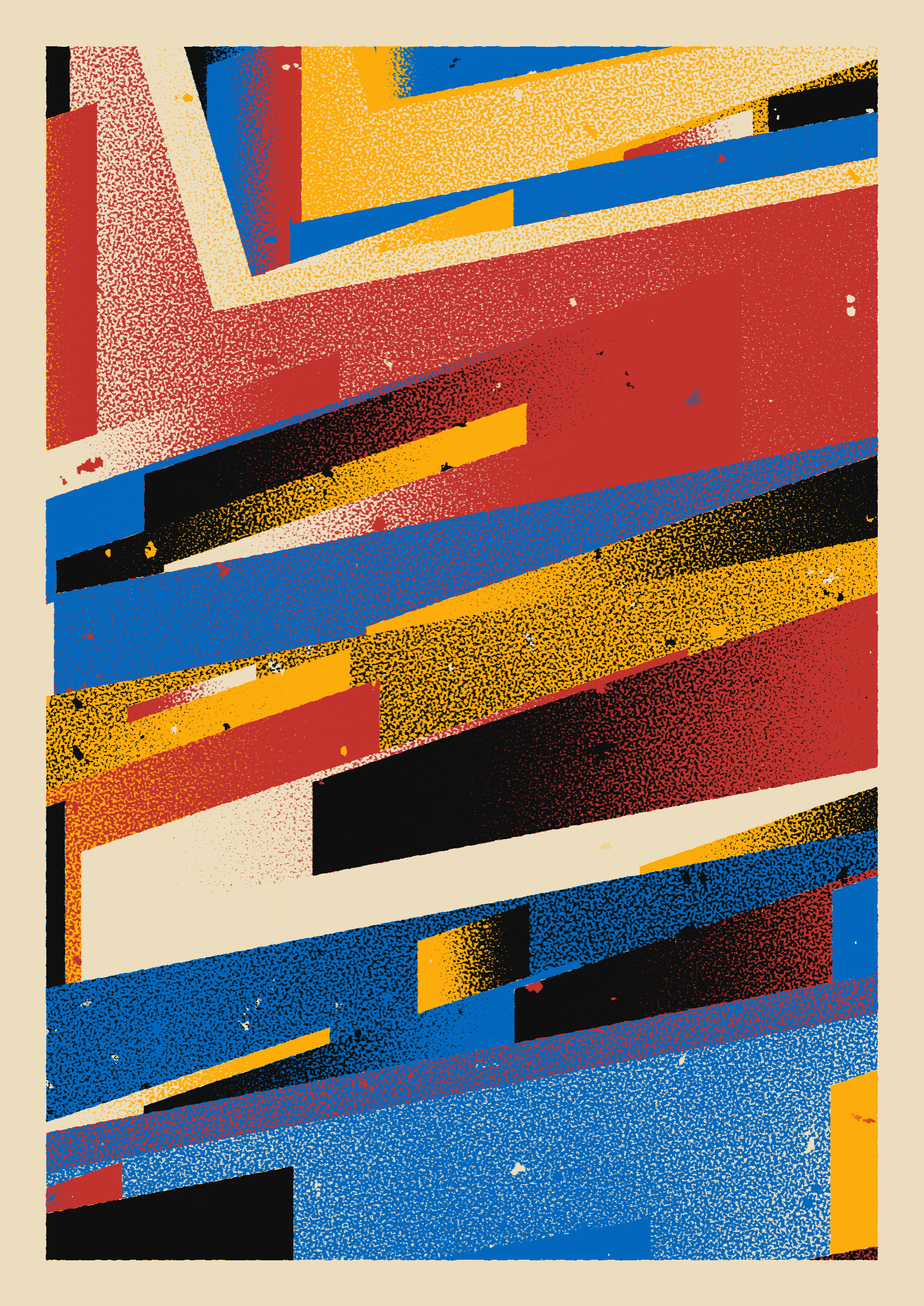 The generative system underlying the rendering mimics the screen printing process by rendering and applying a single color at a time to a master image. Each virtual screen may be more or less aligned with the master, creating a lovely flawed balance to the precision of the rendered geometry.
