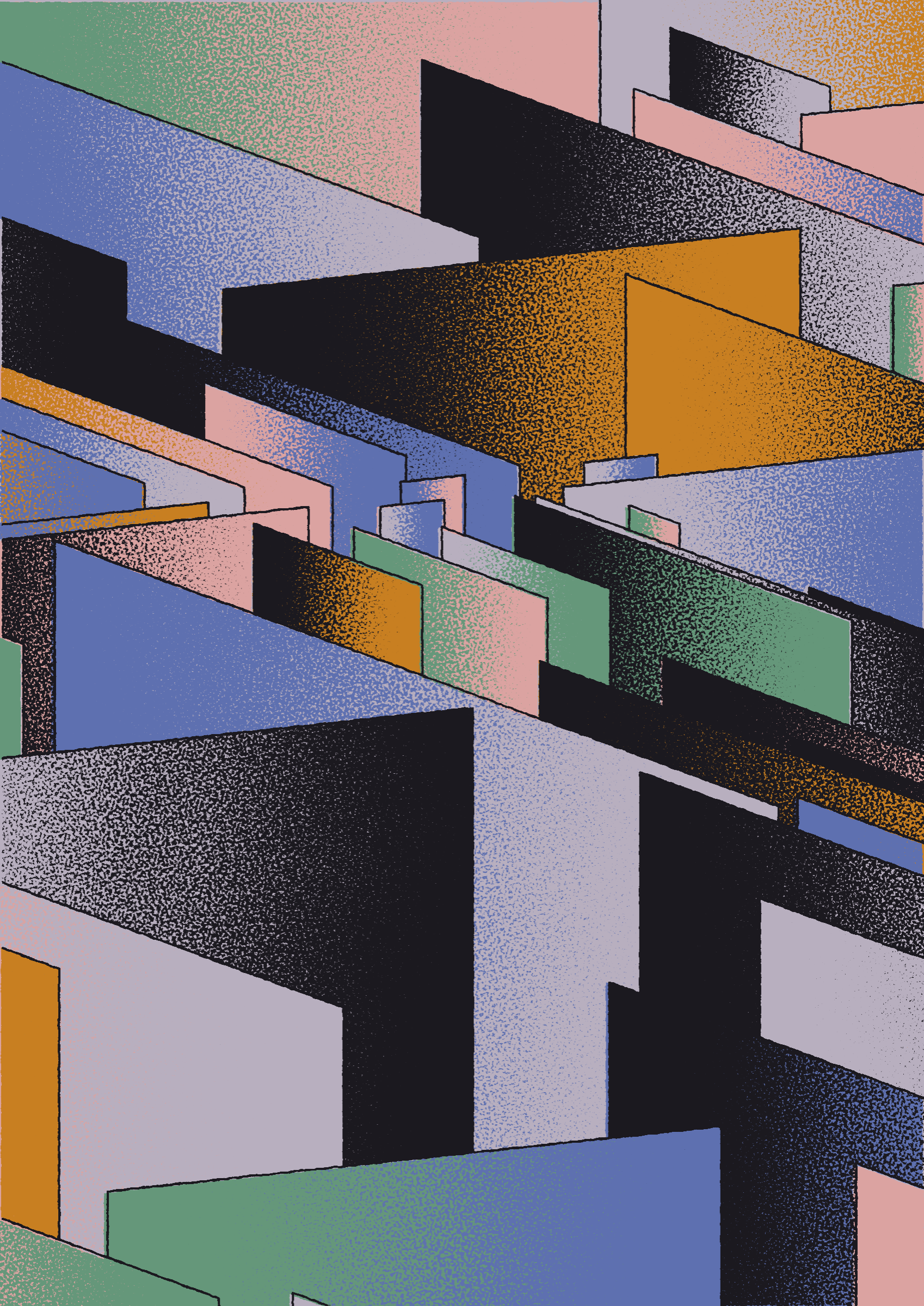 The generative system underlying the rendering mimics the screen printing process by rendering and applying a single color at a time to a master image. Each virtual screen may be more or less aligned with the master, creating a lovely flawed balance to the precision of the rendered geometry.