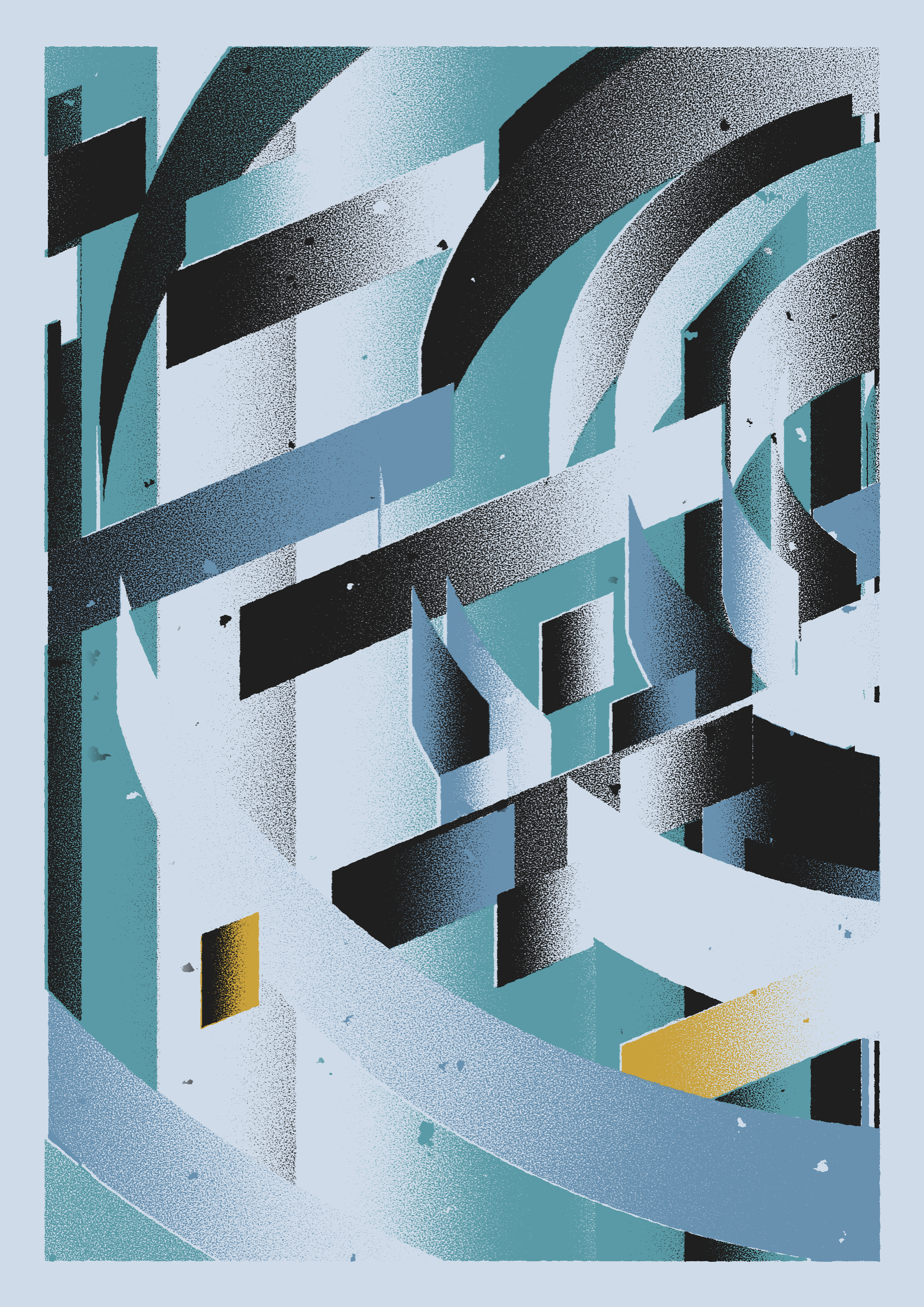 The generative system underlying the rendering mimics the screen printing process by rendering and applying a single color at a time to a master image. Each virtual screen may be more or less aligned with the master, creating a lovely flawed balance to the precision of the rendered geometry.