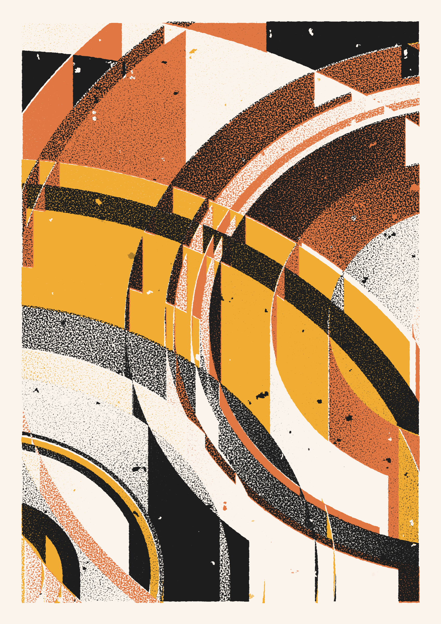 The generative system underlying the rendering mimics the screen printing process by rendering and applying a single color at a time to a master image. Each virtual screen may be more or less aligned with the master, creating a lovely flawed balance to the precision of the rendered geometry.