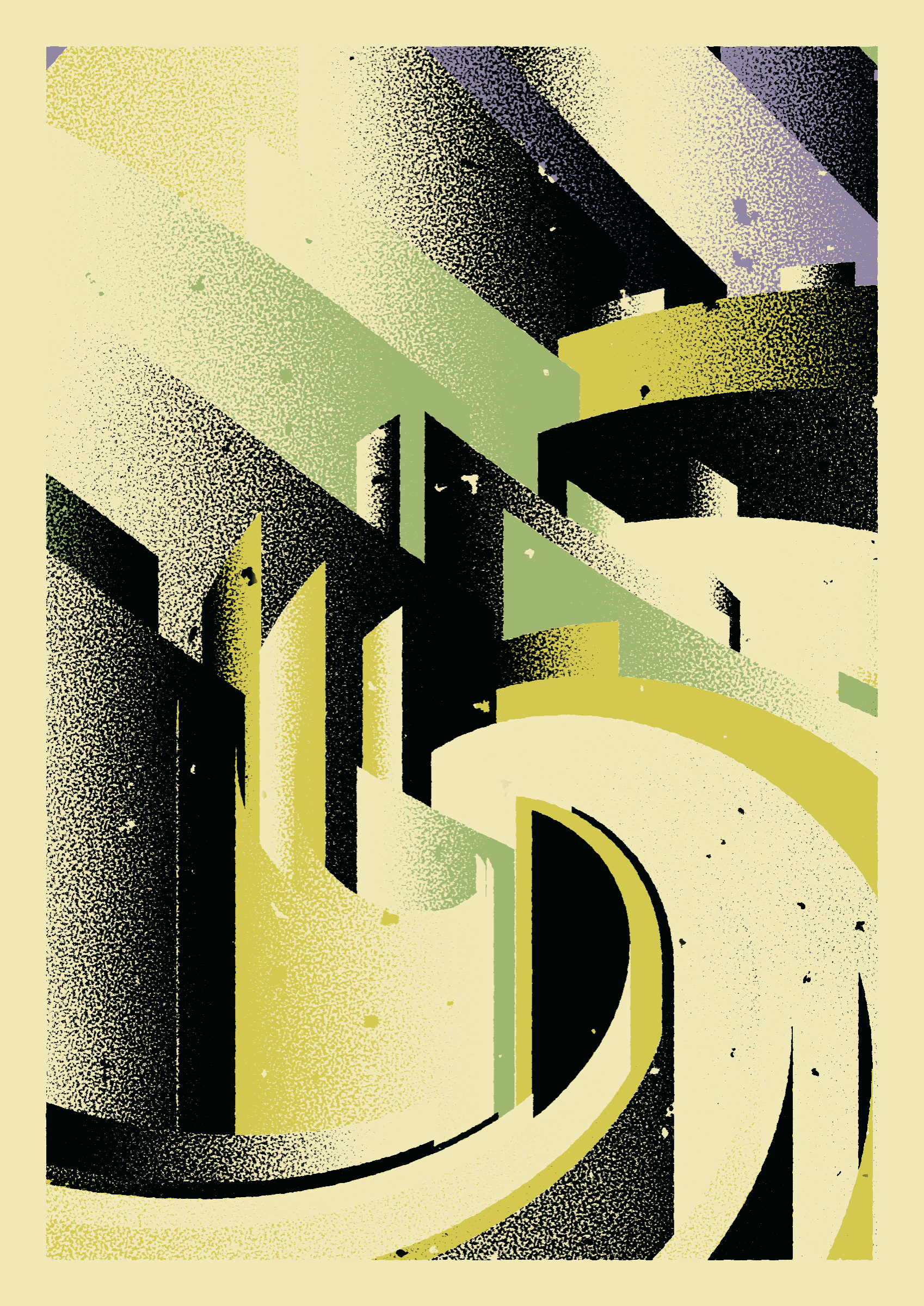 The generative system underlying the rendering mimics the screen printing process by rendering and applying a single color at a time to a master image. Each virtual screen may be more or less aligned with the master, creating a lovely flawed balance to the precision of the rendered geometry.