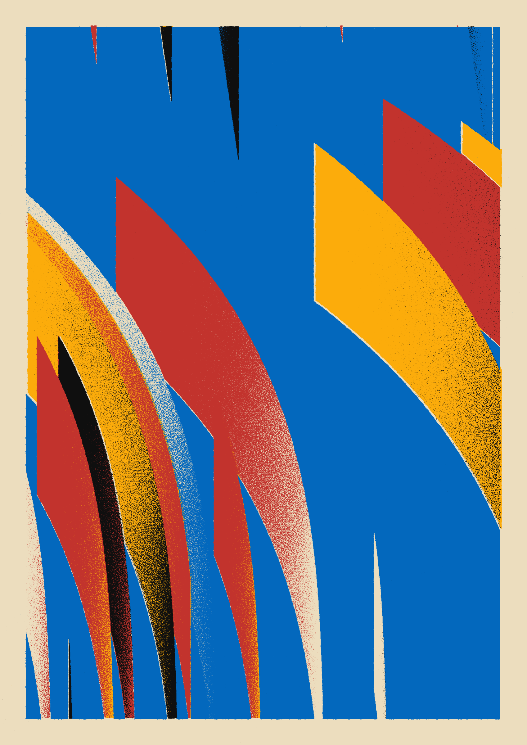 The generative system underlying the rendering mimics the screen printing process by rendering and applying a single color at a time to a master image. Each virtual screen may be more or less aligned with the master, creating a lovely flawed balance to the precision of the rendered geometry.