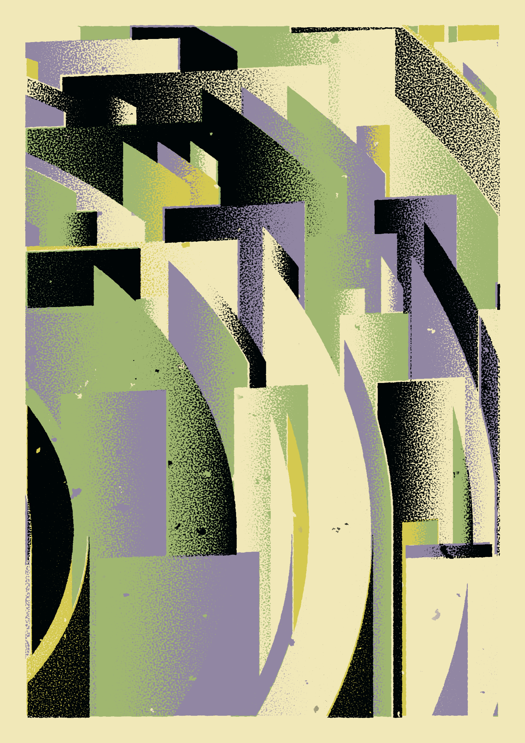 The generative system underlying the rendering mimics the screen printing process by rendering and applying a single color at a time to a master image. Each virtual screen may be more or less aligned with the master, creating a lovely flawed balance to the precision of the rendered geometry.