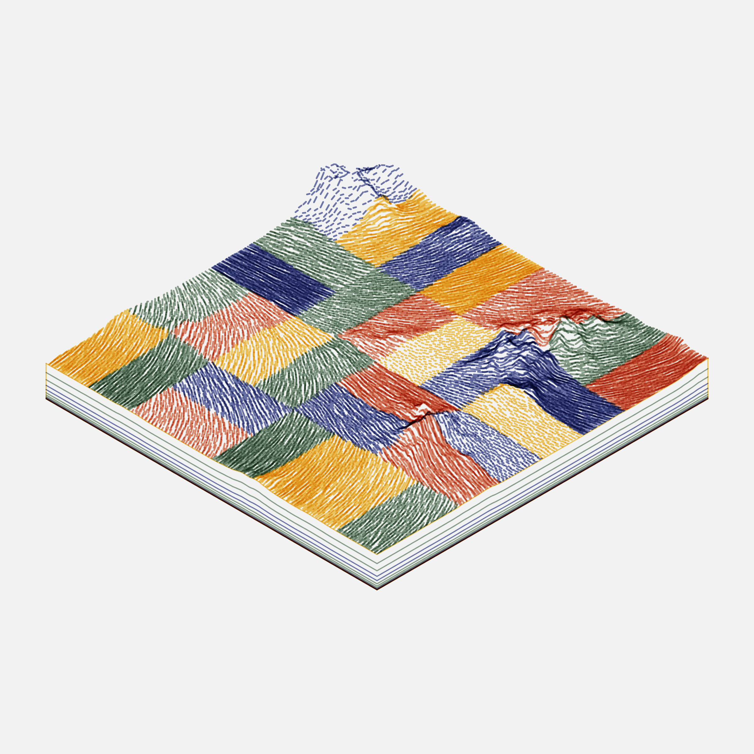 A generative algorithm that draws the impression of a landscape from a multitude of possibilities. The unique seed from each token drives the parametric assortment of lines, colors, and forms into a constructed composition.