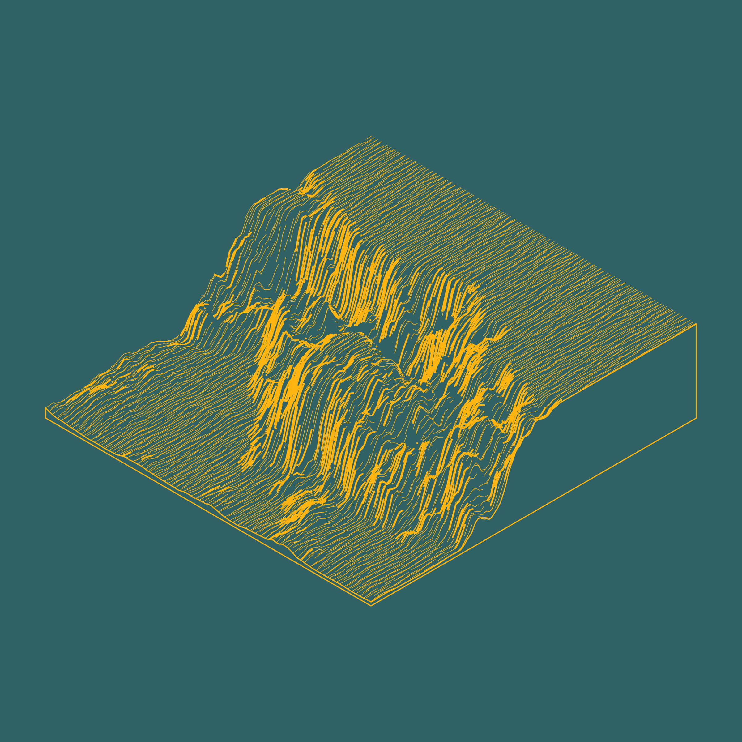 A generative algorithm that draws the impression of a landscape from a multitude of possibilities. The unique seed from each token drives the parametric assortment of lines, colors, and forms into a constructed composition.