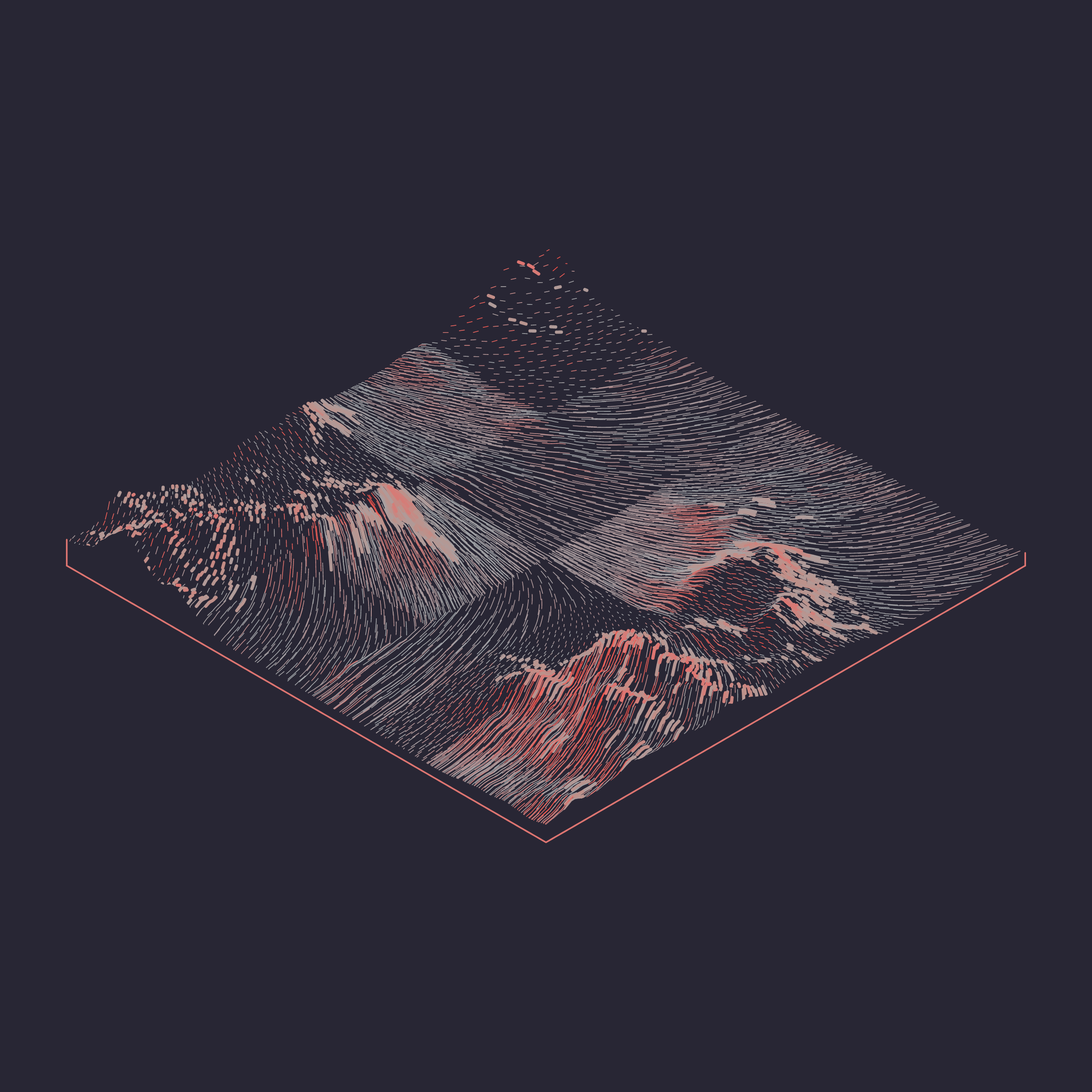A generative algorithm that draws the impression of a landscape from a multitude of possibilities. The unique seed from each token drives the parametric assortment of lines, colors, and forms into a constructed composition.