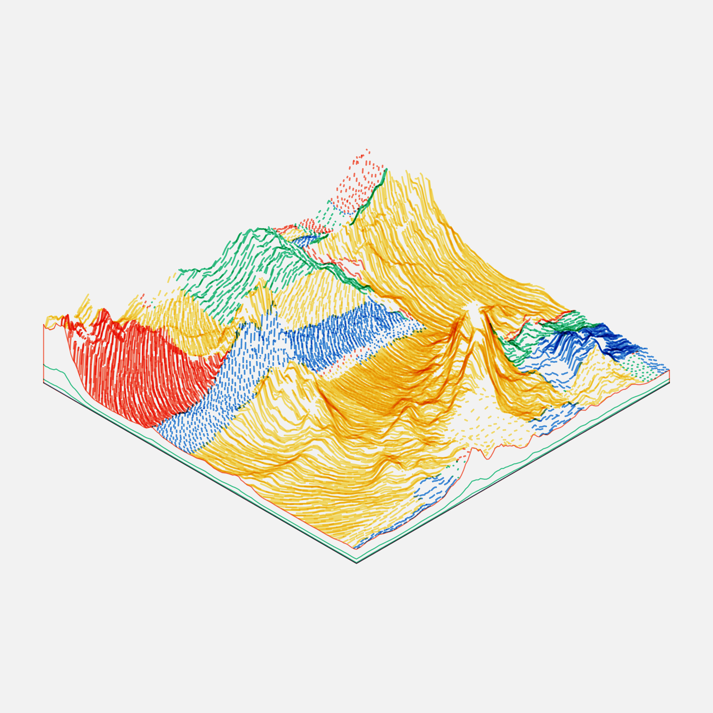 A generative algorithm that draws the impression of a landscape from a multitude of possibilities. The unique seed from each token drives the parametric assortment of lines, colors, and forms into a constructed composition.