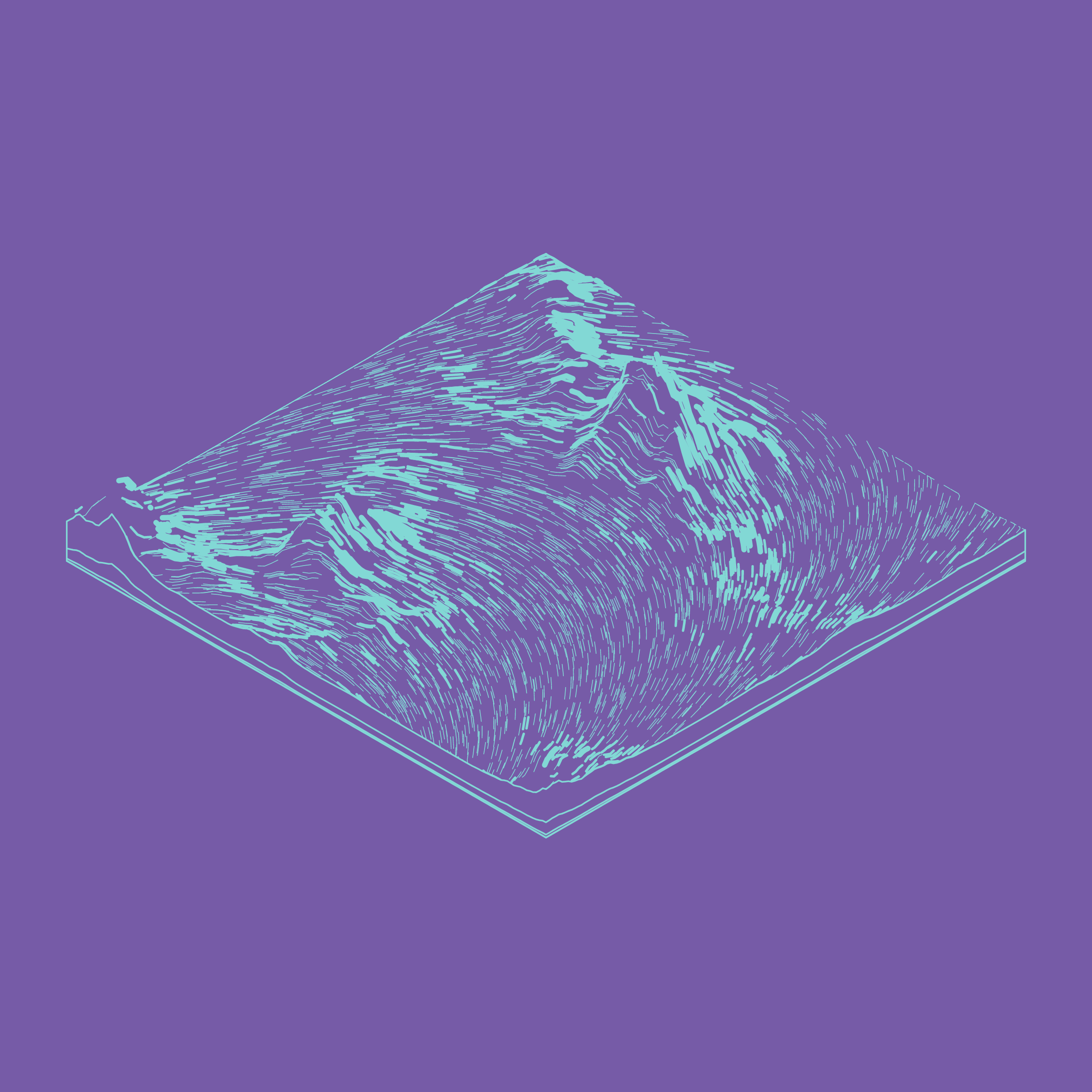 A generative algorithm that draws the impression of a landscape from a multitude of possibilities. The unique seed from each token drives the parametric assortment of lines, colors, and forms into a constructed composition.