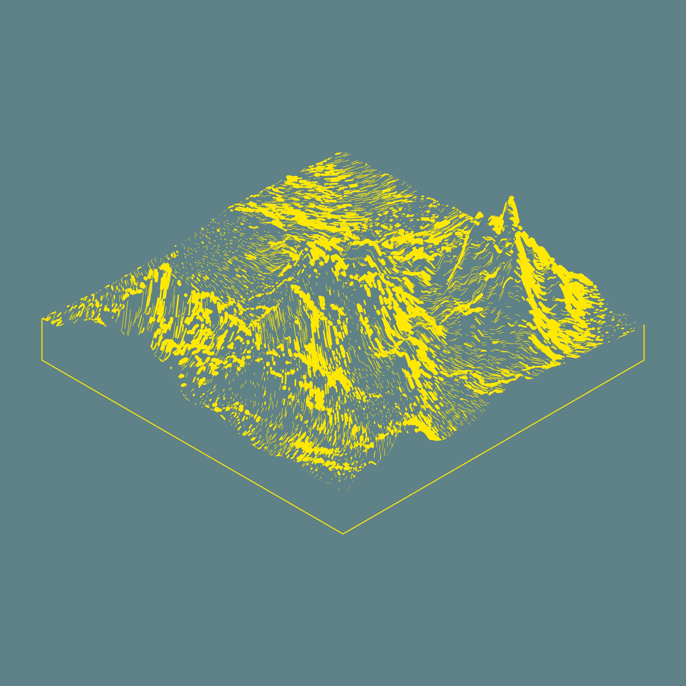 A generative algorithm that draws the impression of a landscape from a multitude of possibilities. The unique seed from each token drives the parametric assortment of lines, colors, and forms into a constructed composition.