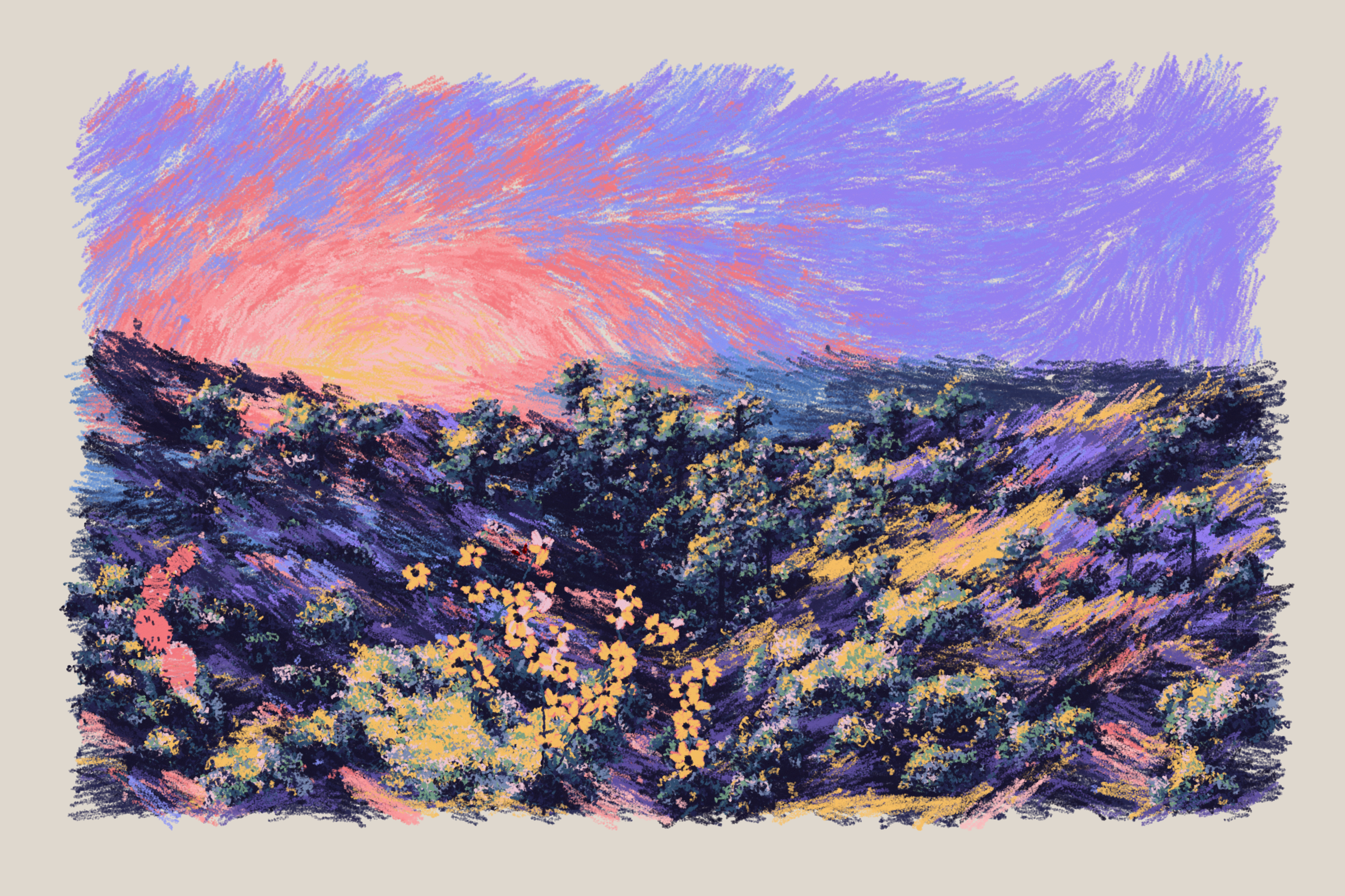 My intention with this work is to capture my memories of those nights, rendered in simulated oil pastels.