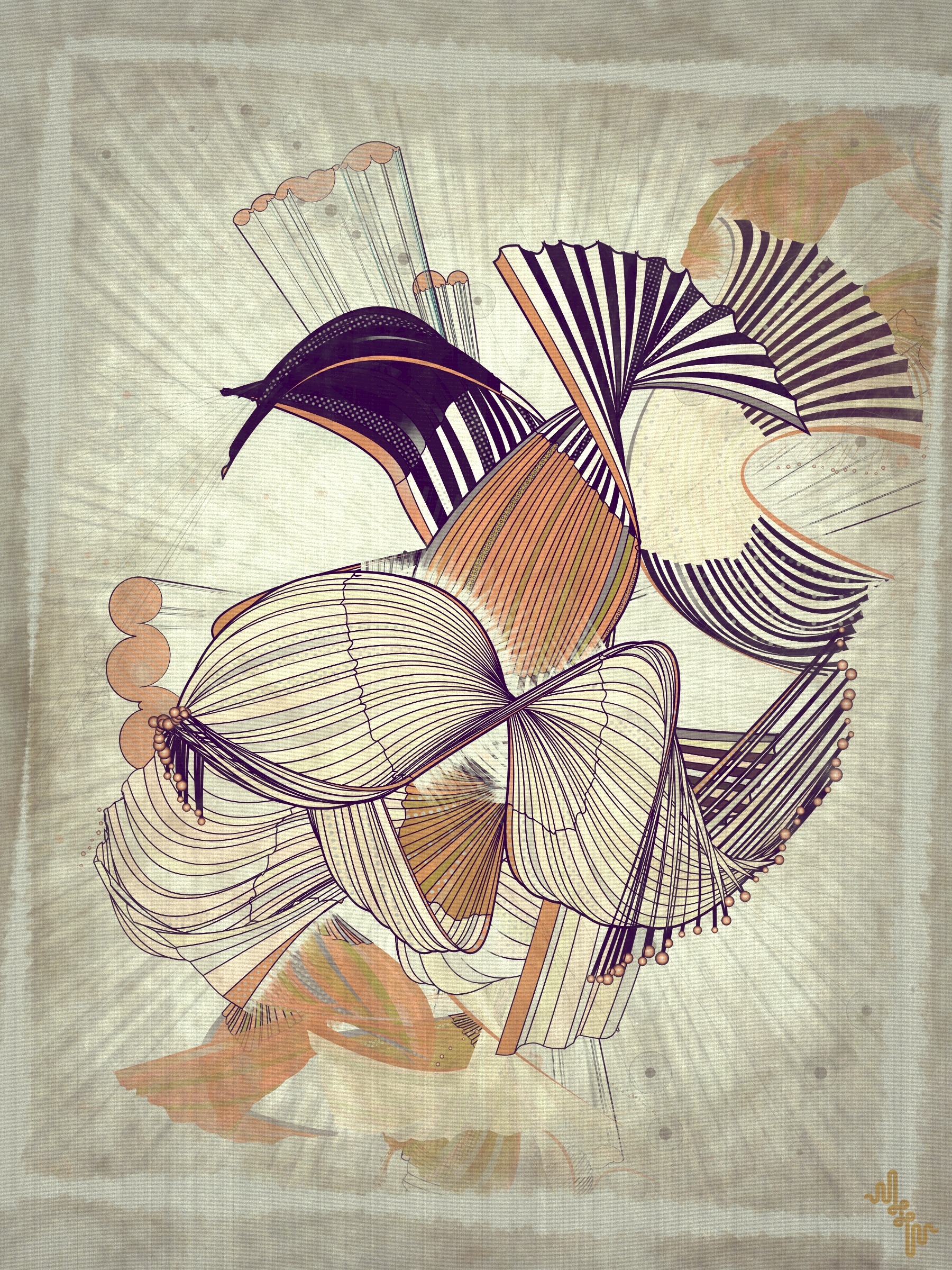 The original ideas evolved by Abstract expressionism and Pop art tell very different stories in the history of post war American art. My approach however is more about just stealing from the visual lexicon of mark-making that characterizes these artistic movements ignoring much of the contextual conversations around them . When I started out building my first primitive for Velum I was picturing in my mind something that looked more like a gestural paint-stroke typical of abstract expressionistic painting. Adding Pop art stylized outlines to the structures however separated them from the background and gave them a floating quality. Liking this effect I quickly forgot about my first idea of making paint strokes to explore the emerging curtain-like elements and found ways to make them dance.